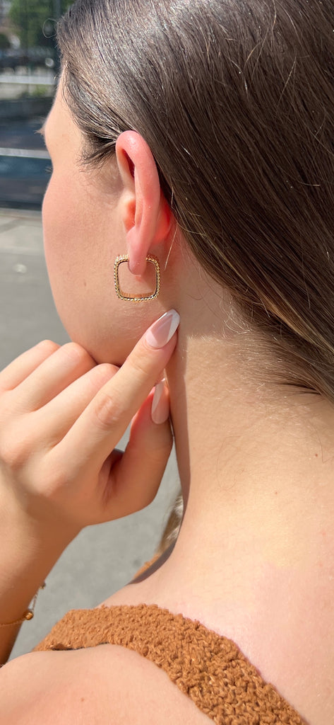 These square earrings are made with 18k gold plated layer , it is microset with white cubic zirconia.
