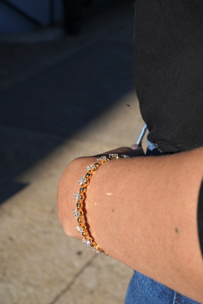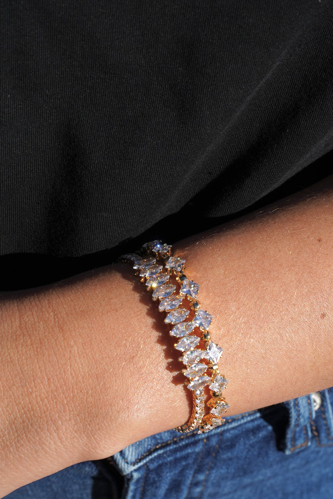 This elegant cuff features meticulously set zirconia stones, adding a touch of brilliance and sophistication. The gold-filled composition ensures lasting quality, while the sparkling zirconia embellishments elevate the bracelet to a statement piece. Adorn your wrist with the perfect blend of luxury and timeless beauty in this 18k gold-filled Zirconia Cuff Bracelet."